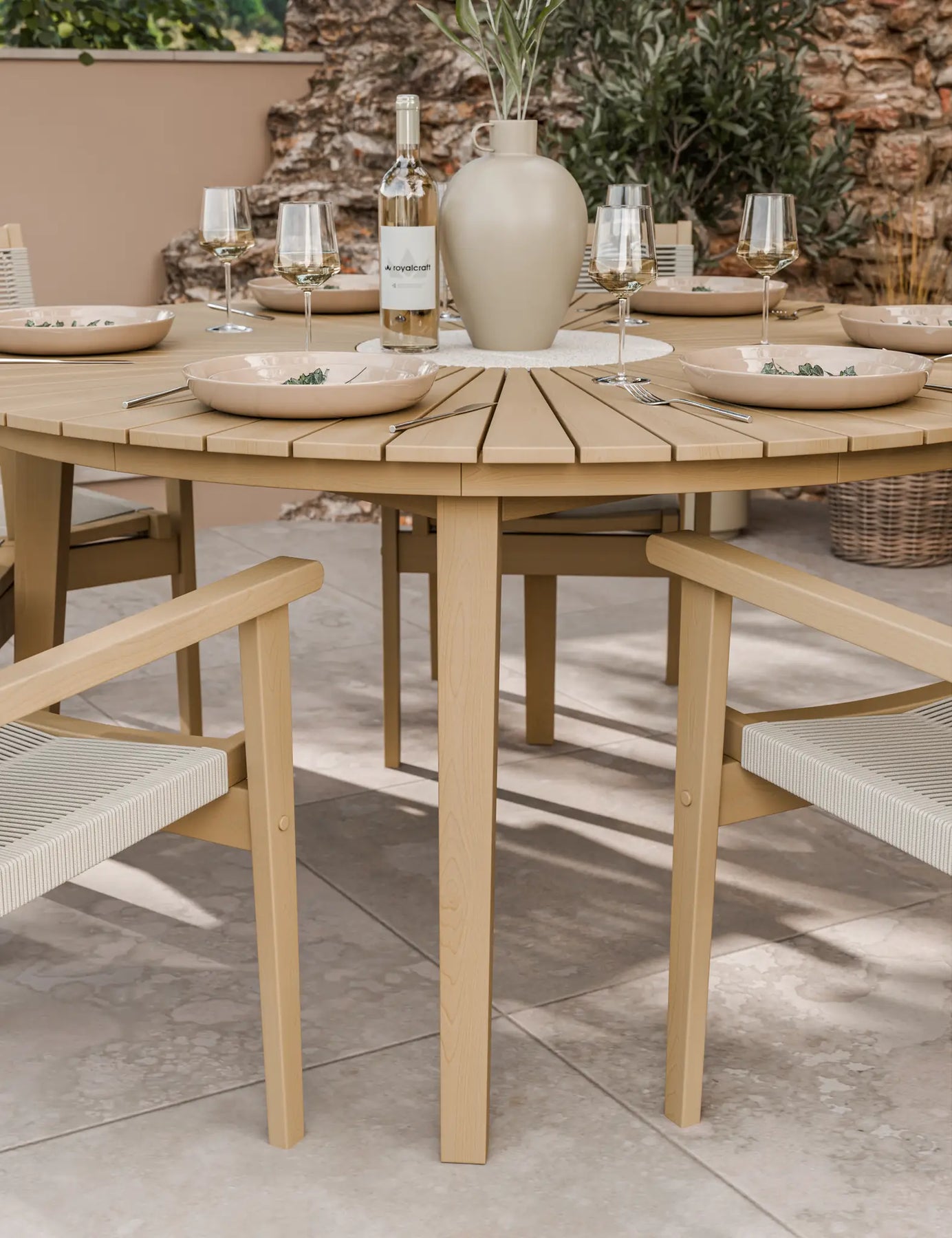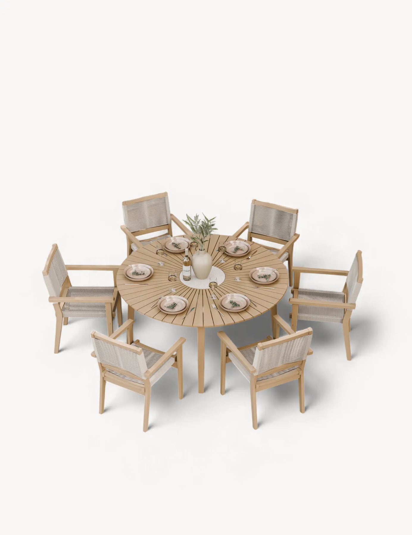 - Mastering the Mixed-Material Trend: Anchor your outdoor entertaining with a true statement piece. This breathtaking 6-seater dining set perfectly embodies the "Curated Wild" aesthetic by masterfully blending warm, sustainably sourced wood with tactile woven rope and a striking terrazzo centerpiece. It delivers a highly curated, boutique-hotel feel that transforms your patio into a premium alfresco dining destination.